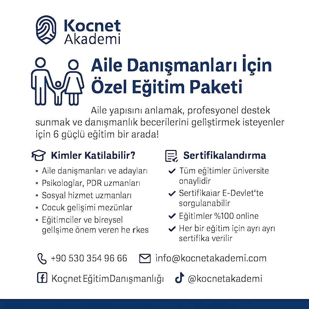 Koçnet Akademi tarafından özel olarak hazırlanan bu kapsamlı eğitim paketi, aile danışmanlığı sürecinde ihtiyaç duyulan temel bilgi, uygulama becerileri ve psikolojik test içeriklerini kapsar. Tüm eğitimler %100 online olup, üniversite onaylı ve E-Devlet’te sorgulanabilir sertifikalarla tamamlanmaktadır.