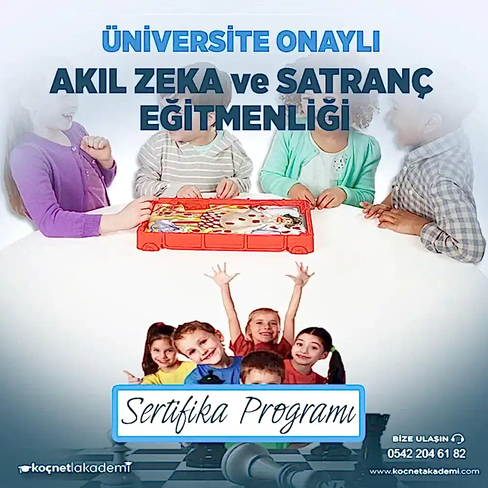 Koçnet Akademi sitemizden alacağınız sertifikayla hem Akıl Zeka Oyunları Eğitmenliği hemde Satranç Eğitmenliği unvanı almış olursunuz. Akıl zeka oyunları eğitimi ile oyun süreçlerini doğru bir şekilde geçiren çocuklarda IQ seviyesinde artış olduğu yapılan araştırmalarla ortaya çıkmıştır. Sunay Akın’ın dediği gibi ” Gelişmiş toplumlarda oyuncak çocuk kendini geliştirsin diye gelişmemiş toplumlarda ise oyalansın diye verilir.” Akıl Zeka oyunları eğitmenlik eğitimi ile öğrencilerinize farklı oyunlar oynatarak onların gelişimine katkı sağlayabilirsiniz.